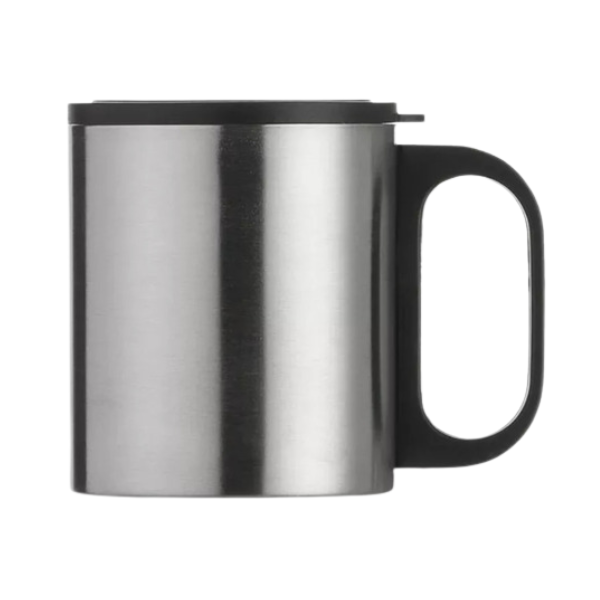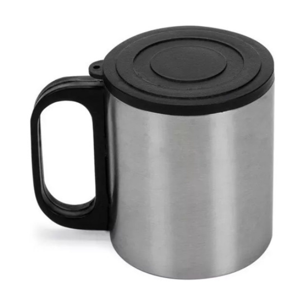 Caneca de inox 180ml com cabo e tampa em plástico resistente (não é térmica).